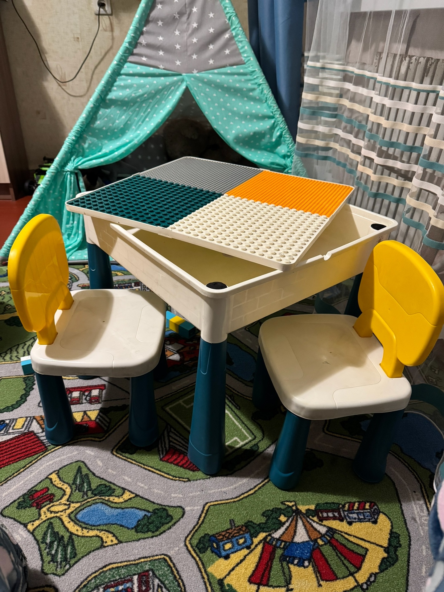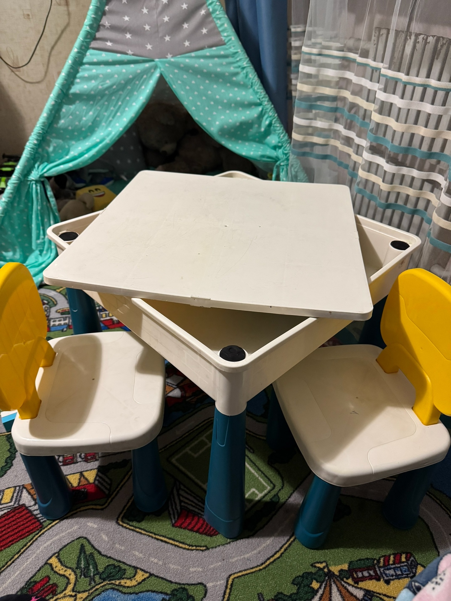 Продам Лего столик,все целое,есть два контейнера для карандашей и фломастеров,внутри большой поддон для игрушек,два стульчика,цена 1500 р.