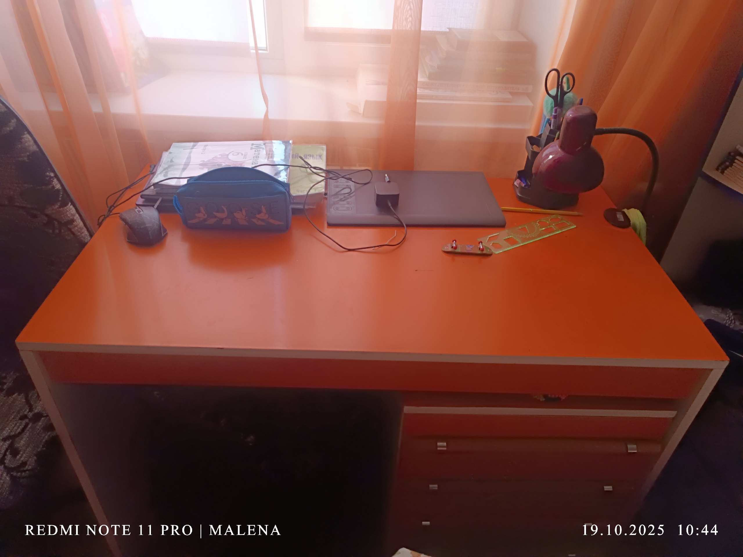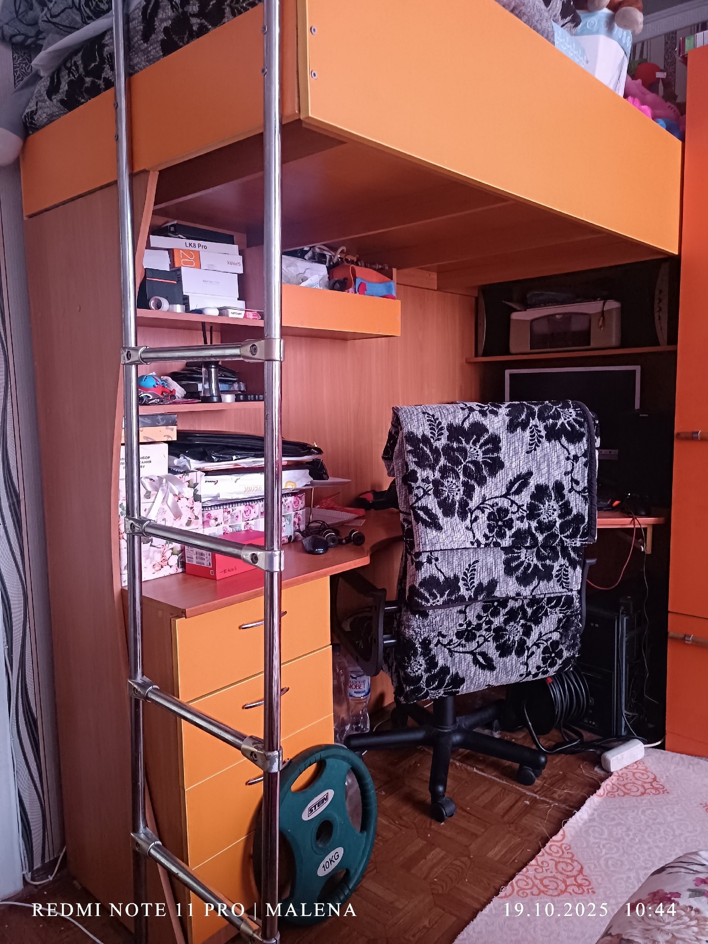 Кровать — чердак с матрасом(200×90 см) ,стол компьютерный угловой под кроватью с тумбой ,и отдельно стоящий стол письменный с выдвижной тумбой.