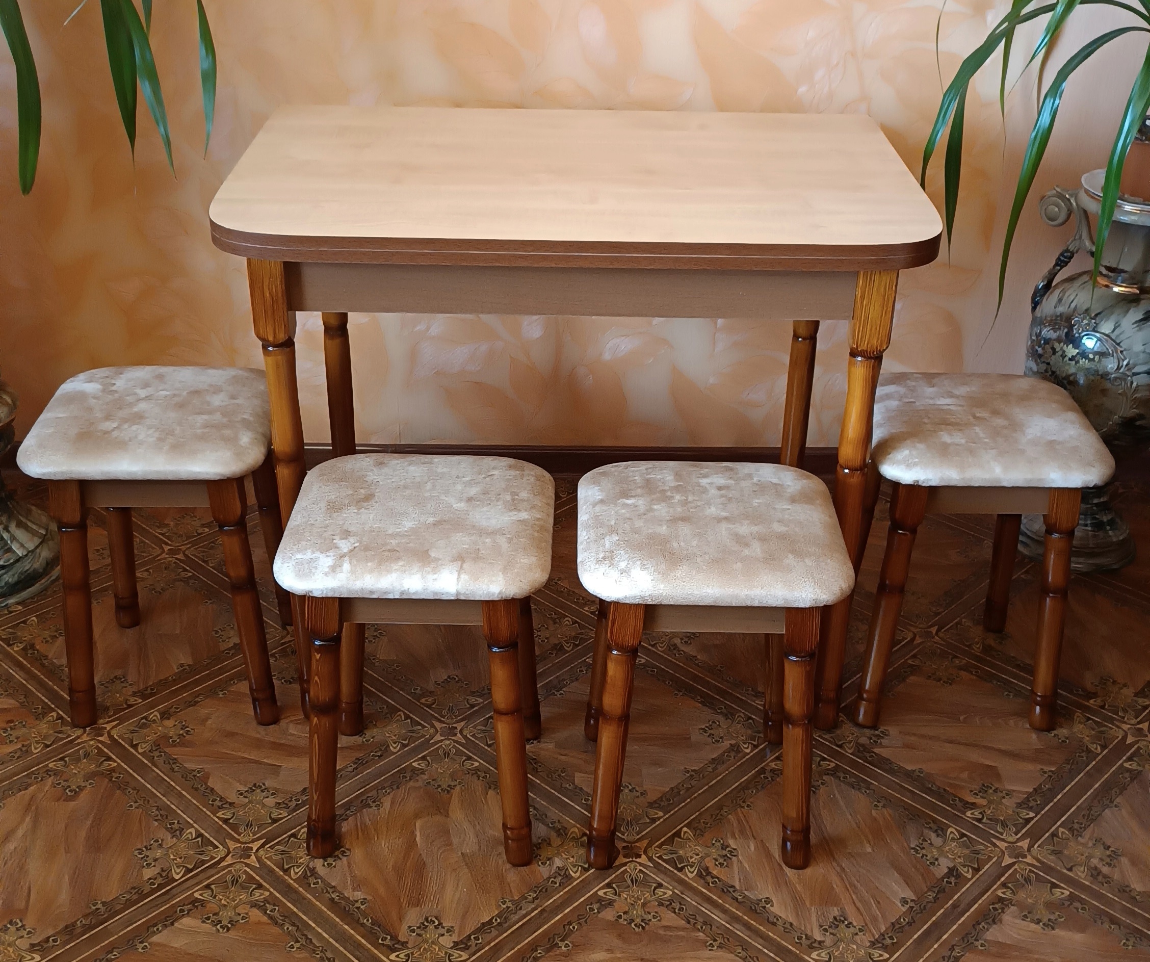 Качественный и красивый набор с железным креплением и мягкий верх из ткани или кожзама. Ножки из сосны, покрытые глянцевым лаком. Яркие цвета, вживую намного красивее, чем на фото. Все наборы, которые на фотографиях, — в наличии на момент публикации.