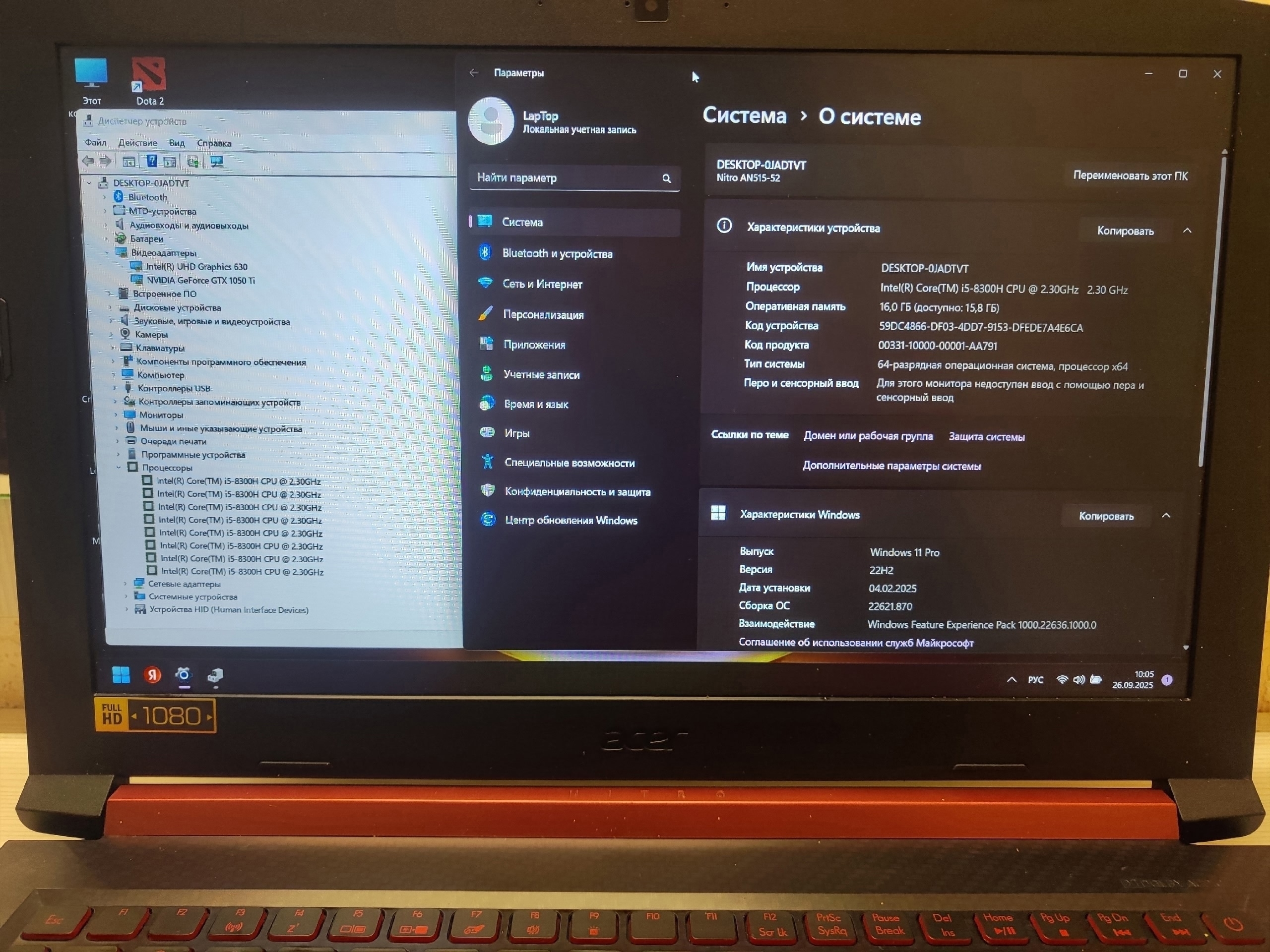 Πpoцeccop Intel Core i5-8300H, 8е поколение, 4 ядра + 8 потоков по 2.30 — 4.00ГГц.