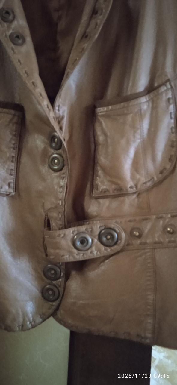 1. Куртка женская из натуральной кожи. Производство Турция. Цвет светло-коричневый (на фото цвет искажен, наяву насыщенее и красивее). Стильная, кнопки оригинальные. Можно менять фасон за счет воротника и застёжки на поясе. Когда мягкая, качественная. Размер 52-54-56. Надо мерять. Цена 2000руб.