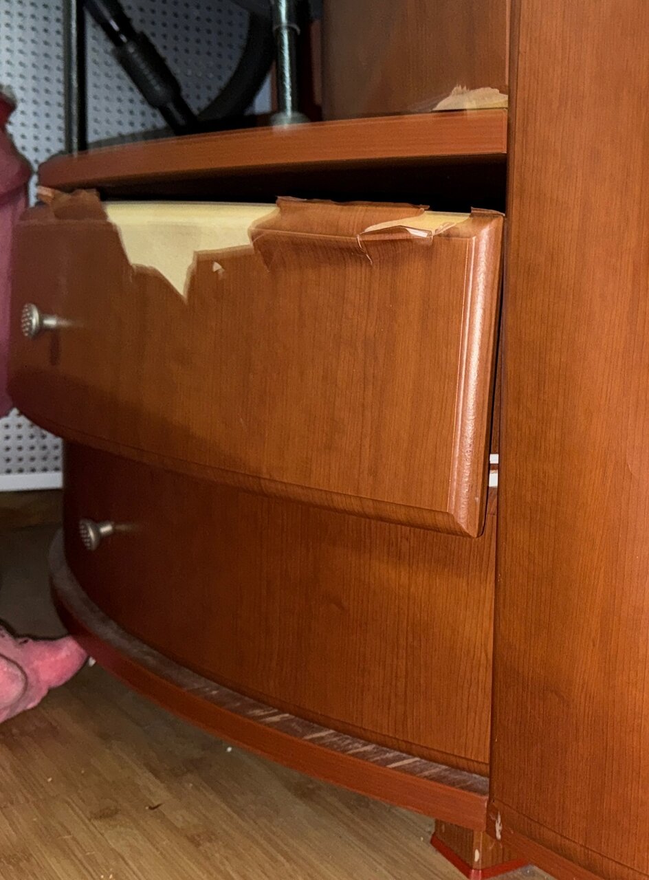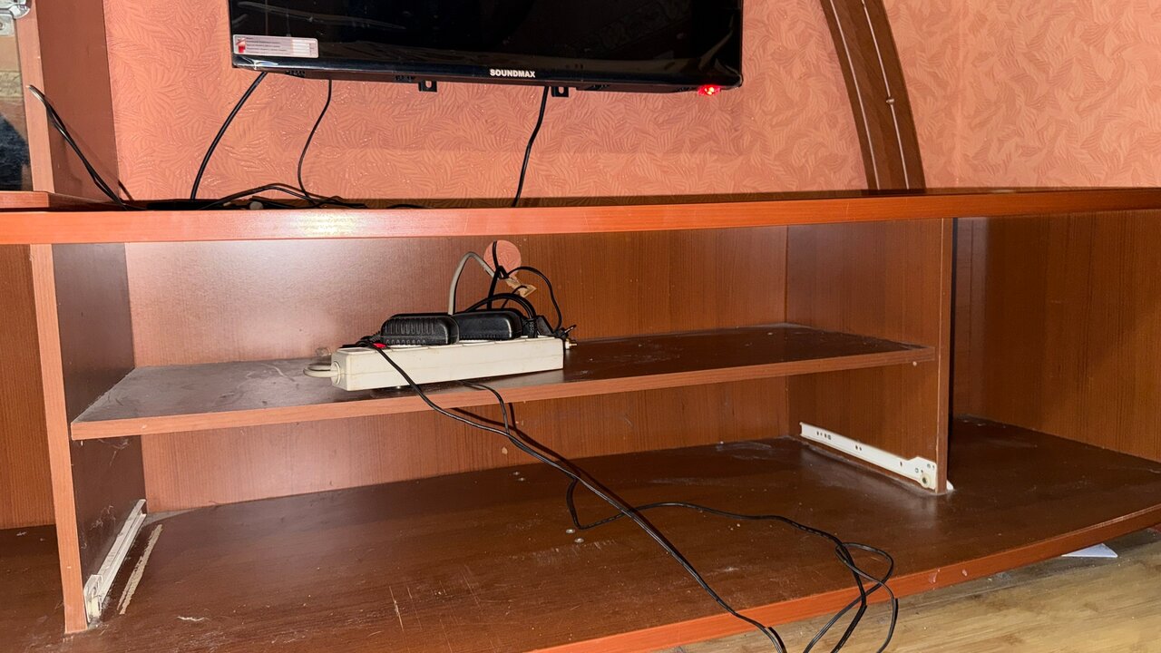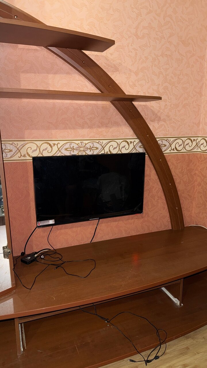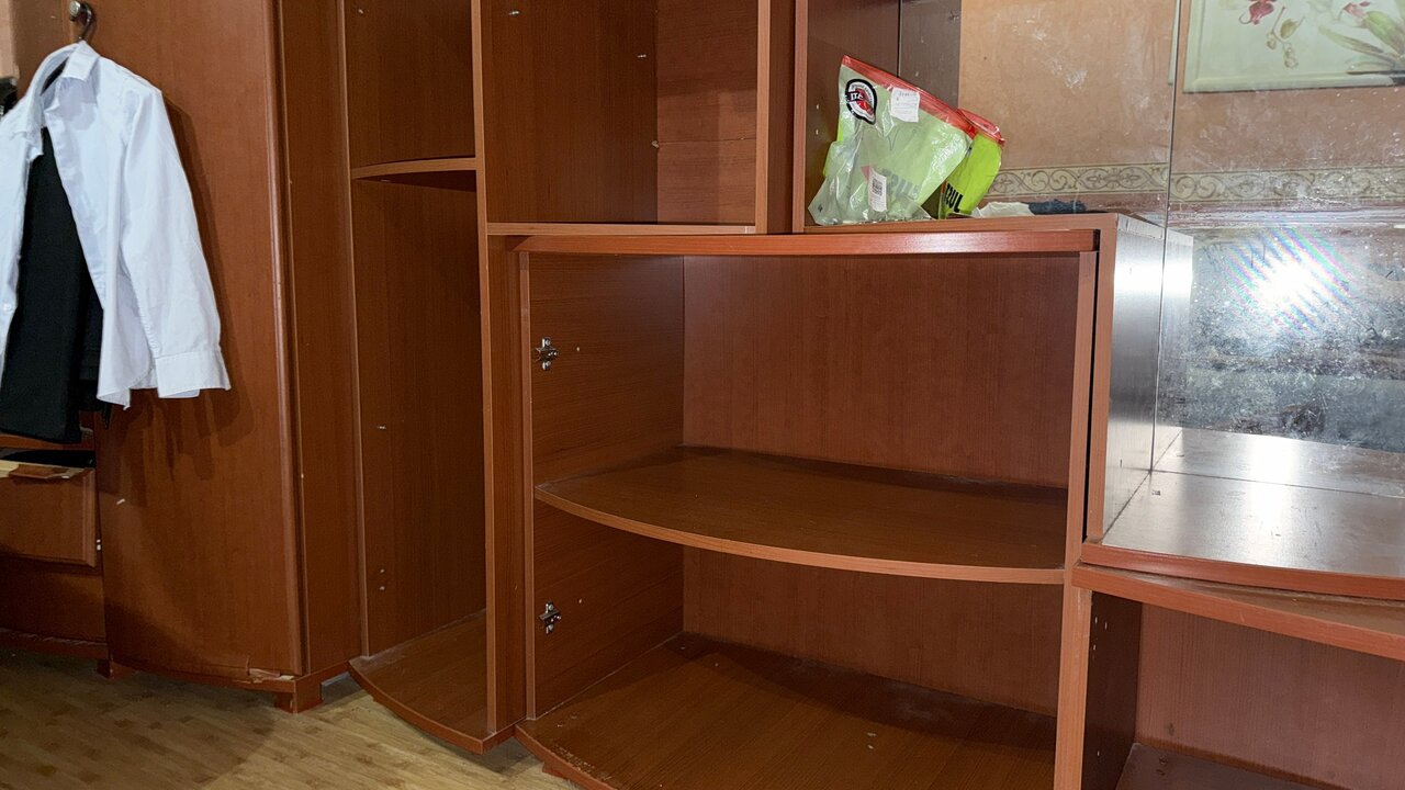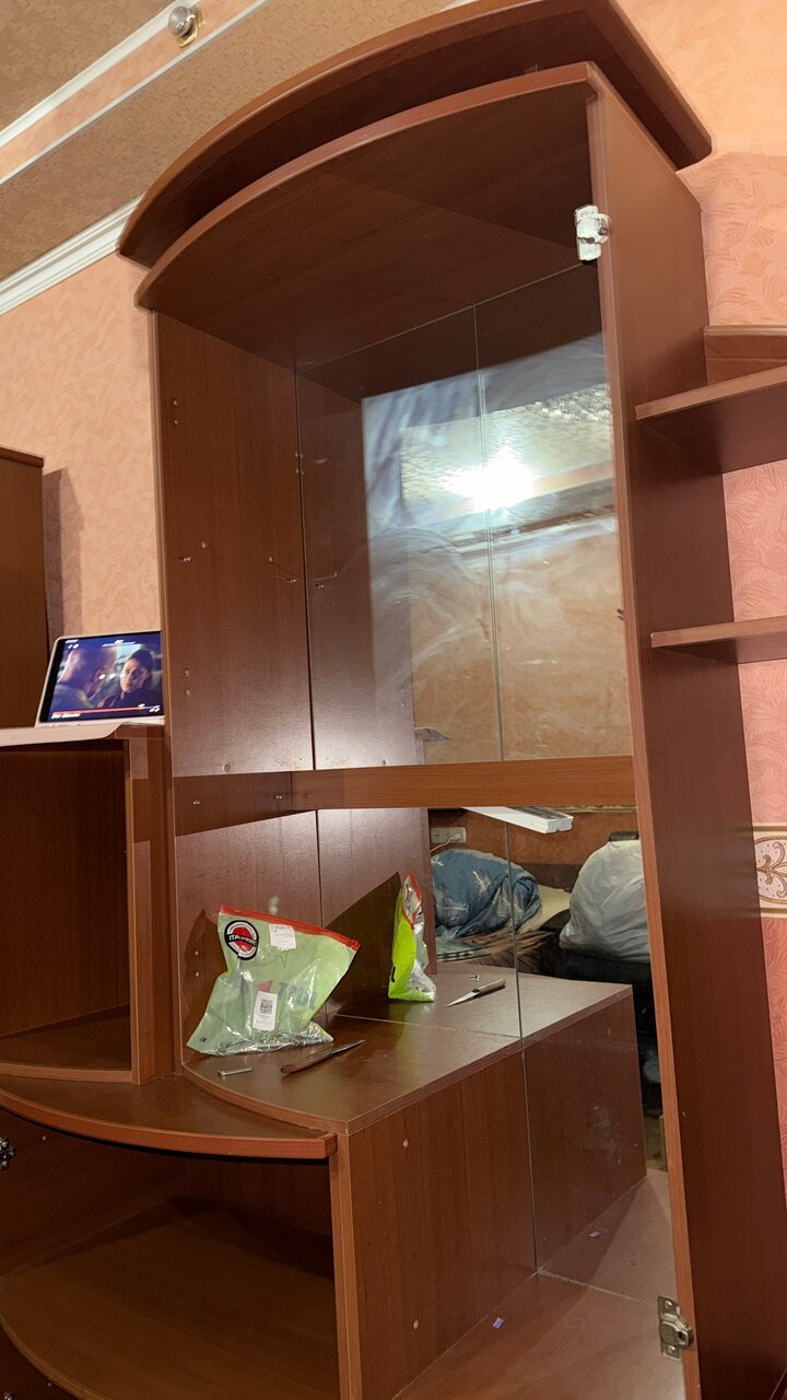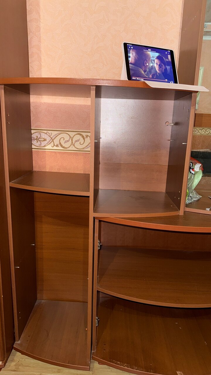 По минусам — отсутствуют стеклянные дверцы в стеклянном шкафчике, и в некоторых местах оторвана обклейка