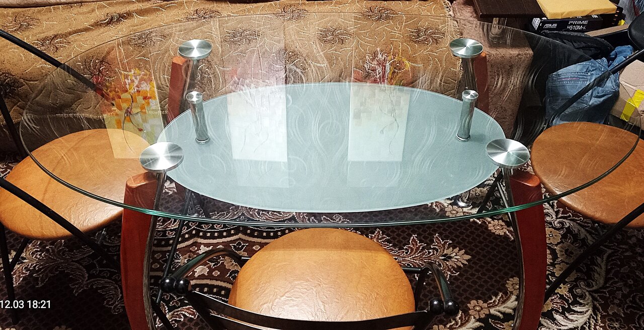 Качественный стол закаленного стекла с матовой полкой. размер 1,5м х 0,9м без царапин и сколов,состояние нового. на ножках накладки из цельного дерева. в комплекте 4 складных стула, тяжелые ,прочные, до 150кг. (не Китай) ✅17т.руб. отдаю за 1\2 магазинной цены.