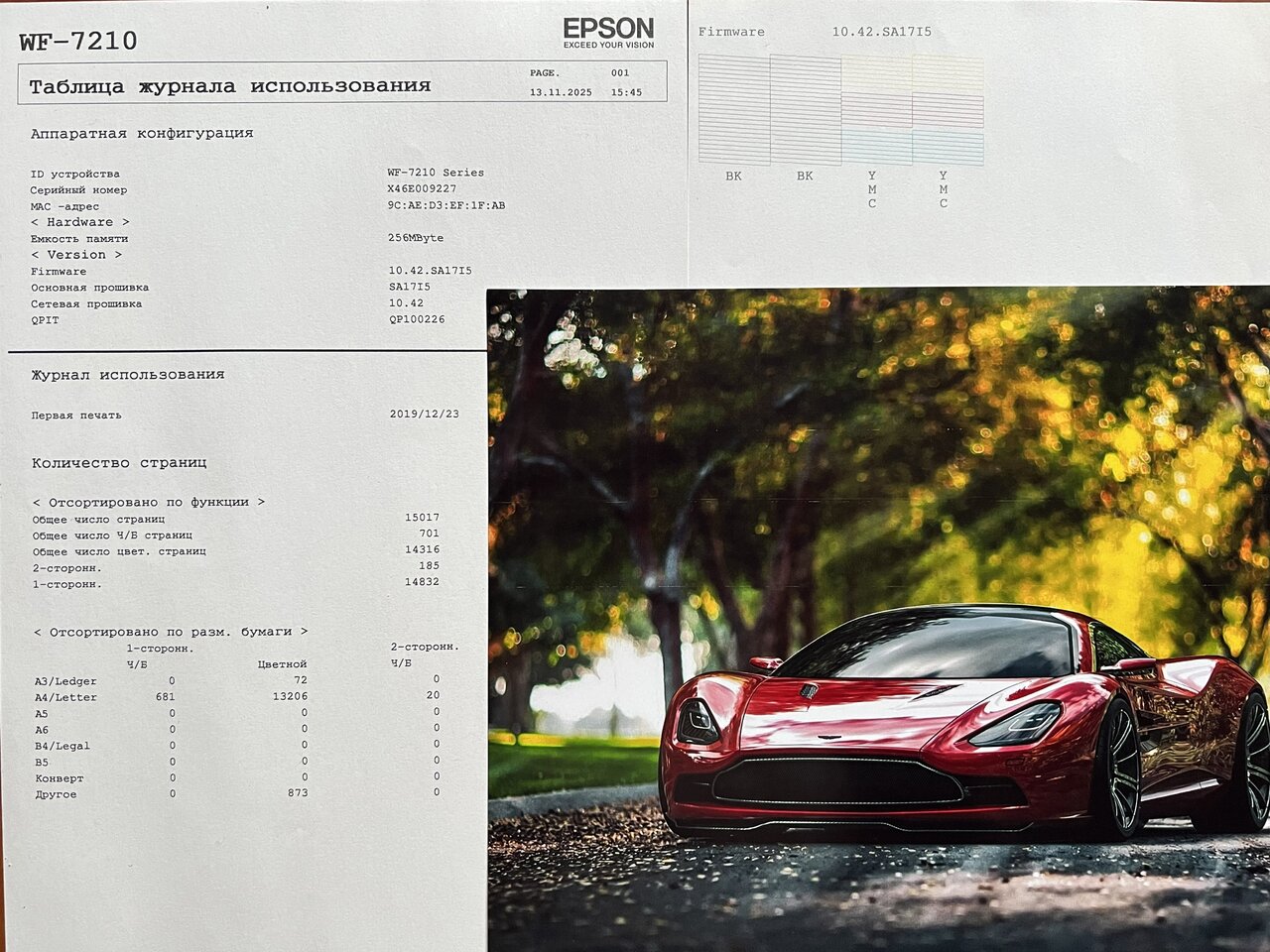 Продам надёжный, профессиональный принтер Epson WorkForce -7210DTW, формат А3+ Полный комплект с оригинальной упаковкой в отличном техническом состоянии. Систему СНПЧ устанавливали в сервисном центре магазина при покупке принтера. Напечатанное число страниц: 15017, тест дюз 100%, без ремонтов. Epson WF-7210DTW – это одна из самых надёжных моделей компании. Принтер печатает быстро и качественно. На последнем фото – таблица журнала использования принтера, тест дюз и напечатанная принтером фотография.