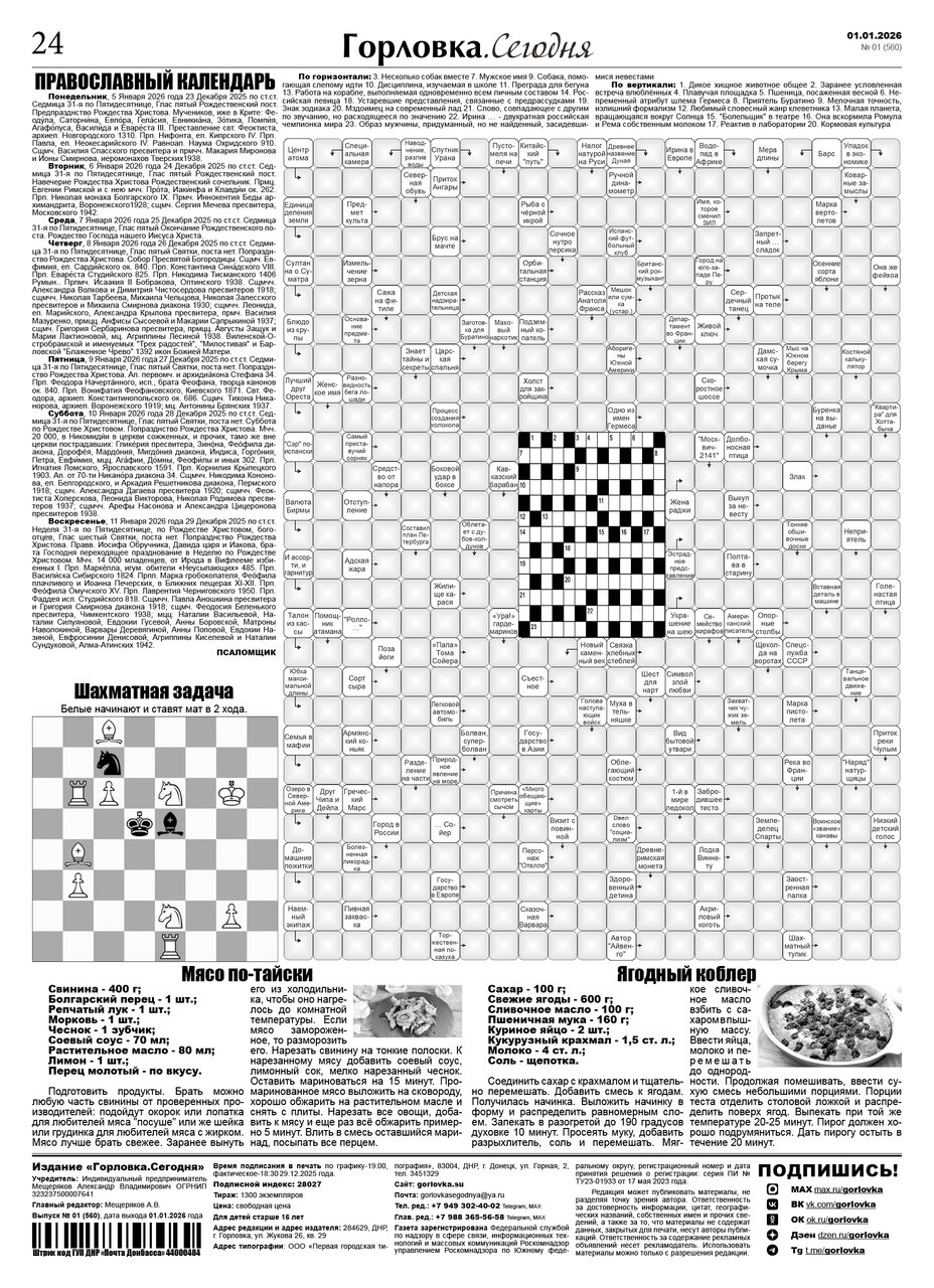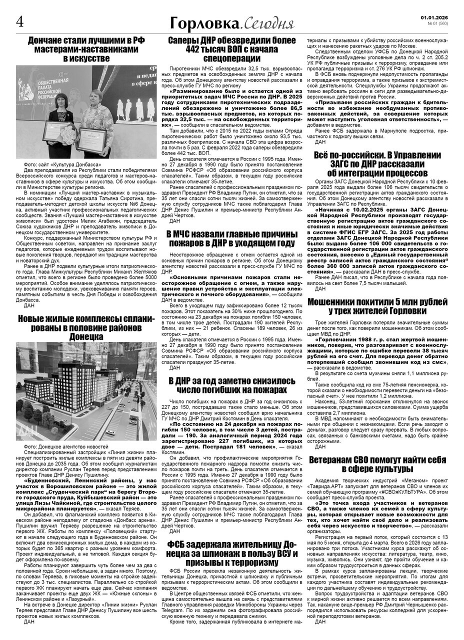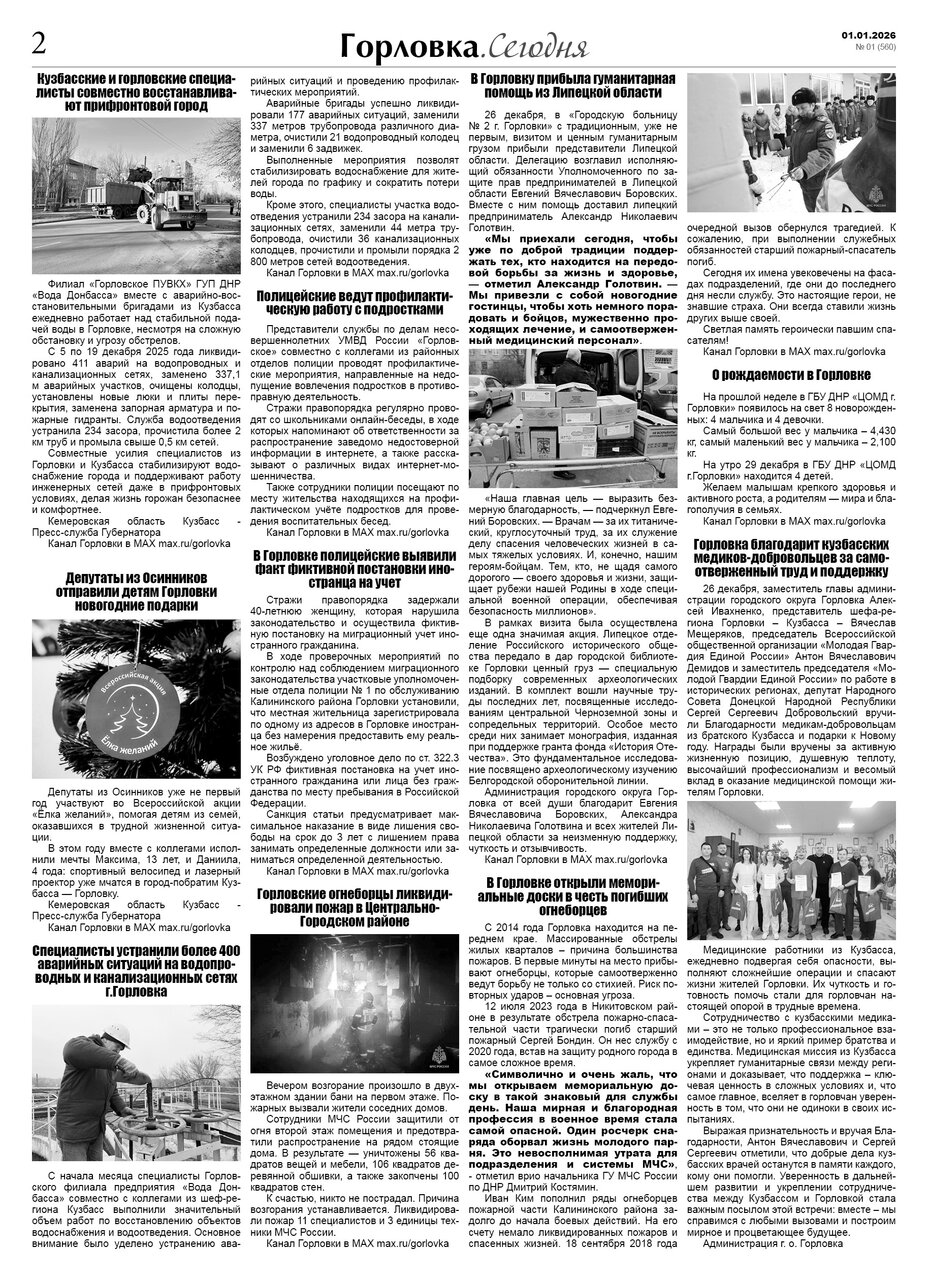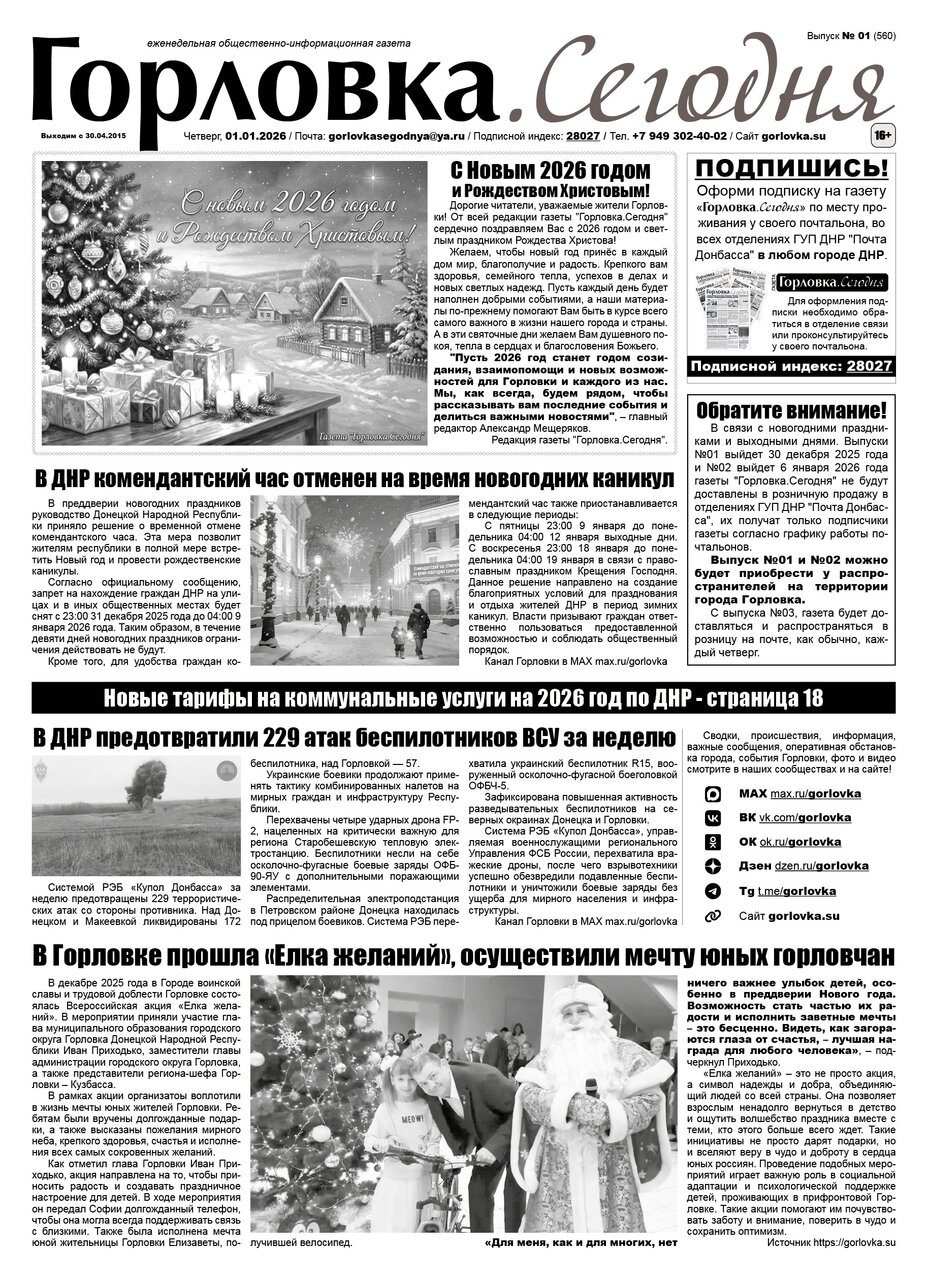 🗞 01 января 2026 года, вышел новый выпуск общественно-информационной газеты «Горловка.Сегодня» 🇷🇺 №01 (560). 24 полосы, тираж 1300 экз., газета выходит каждый четверг. 📰 https://t.me/gorlovka