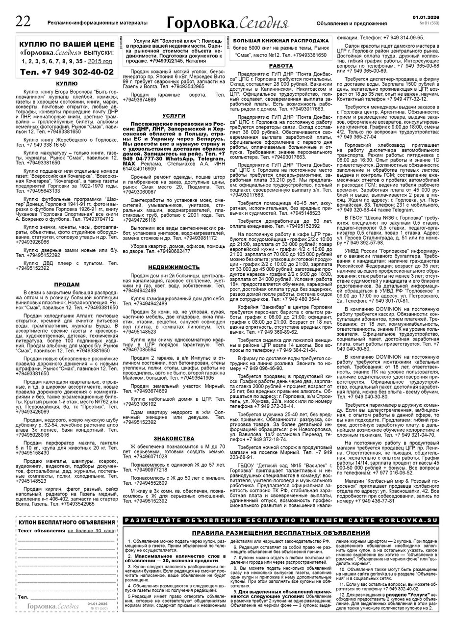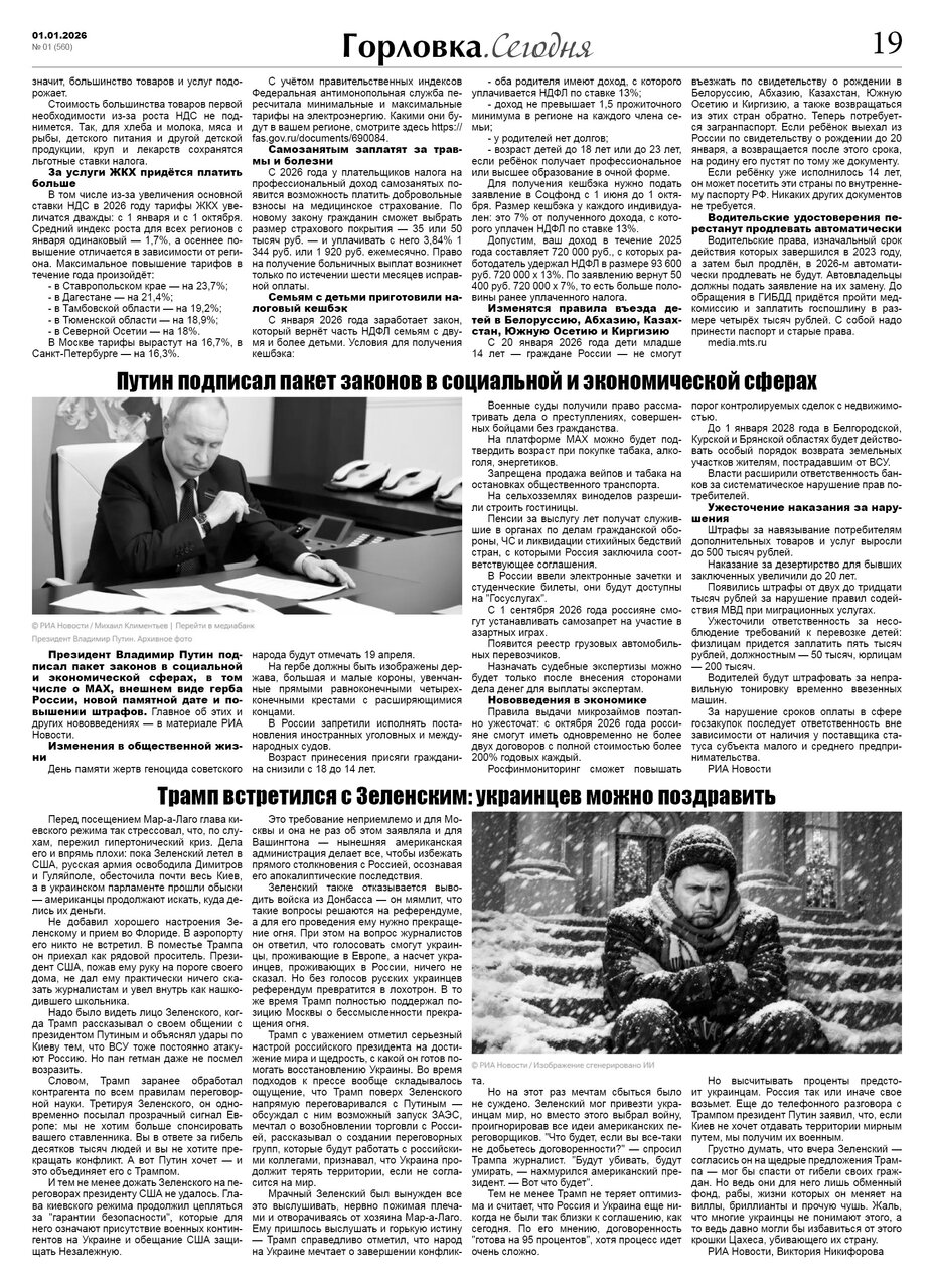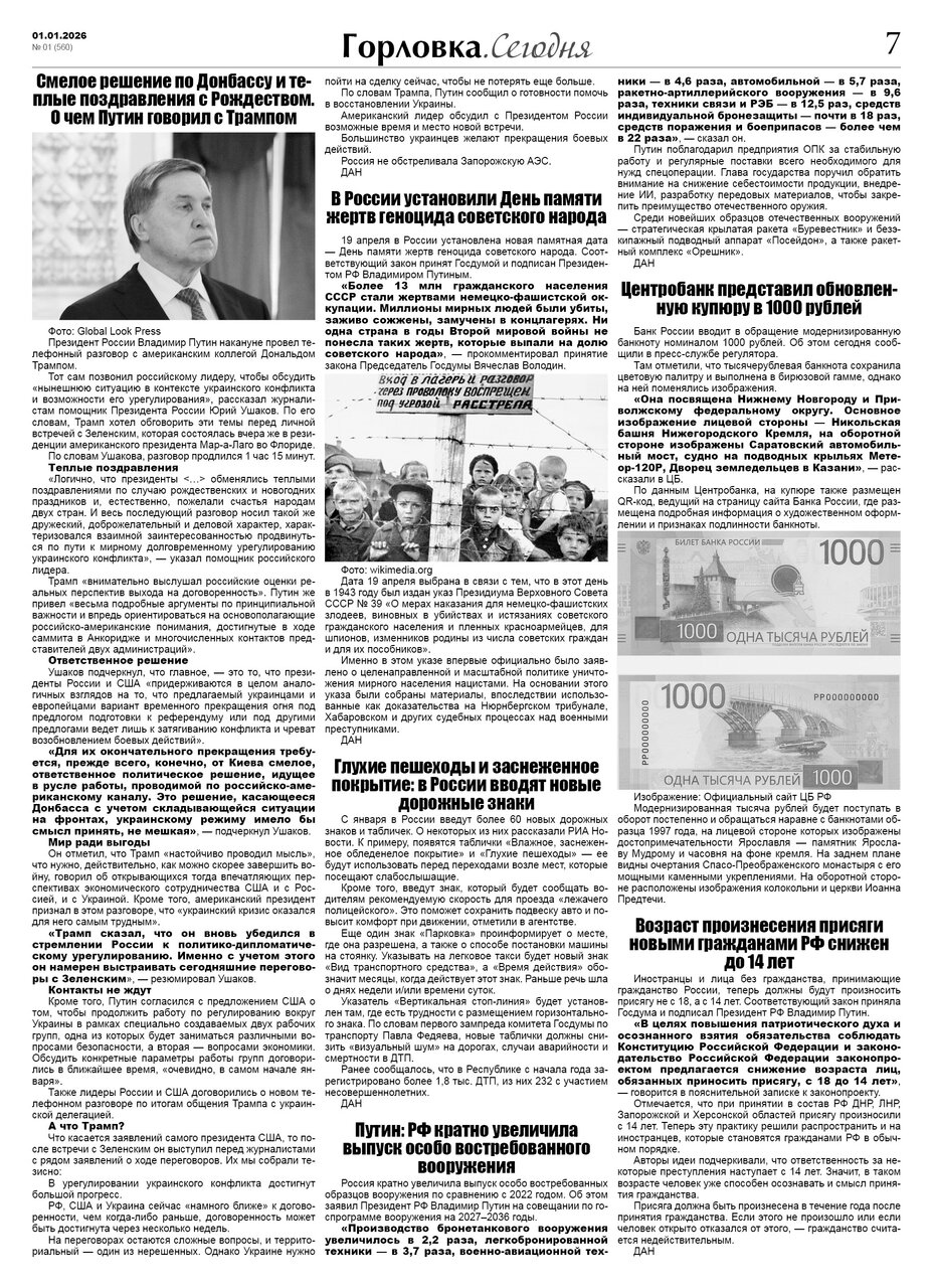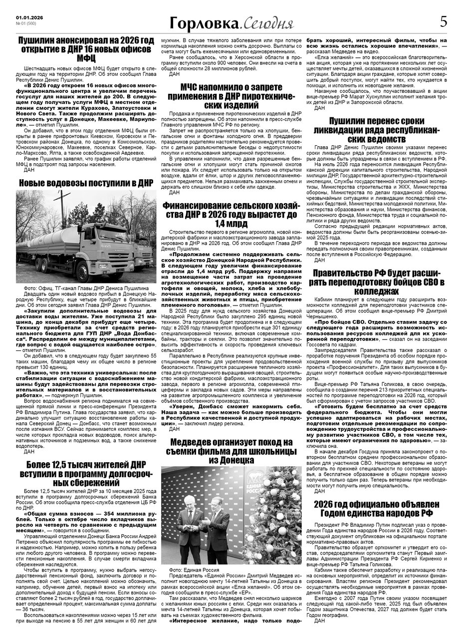 🗞 01 января 2026 года, вышел новый выпуск общественно-информационной газеты «Горловка.Сегодня» 🇷🇺 №01 (560). 24 полосы, тираж 1300 экз., газета выходит каждый четверг. 📰 https://t.me/gorlovka