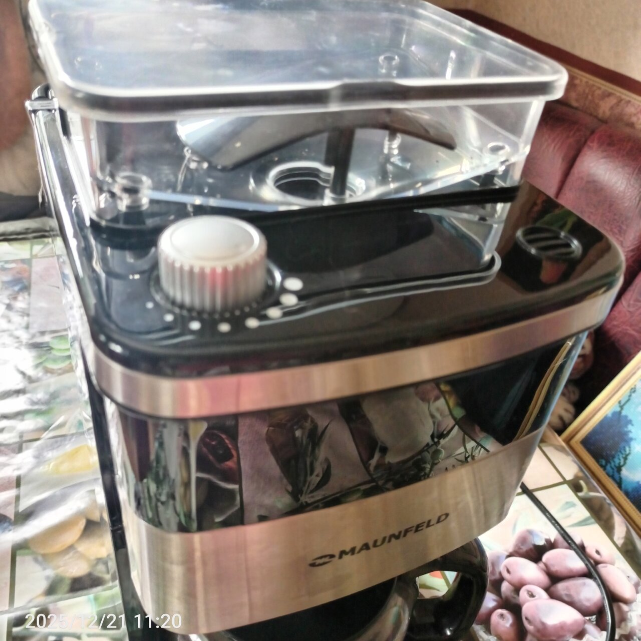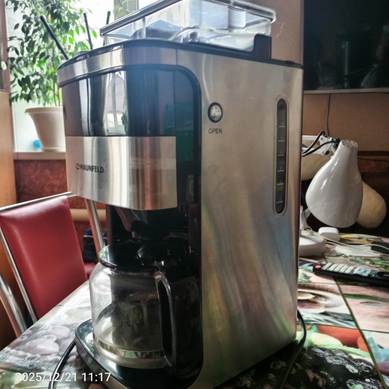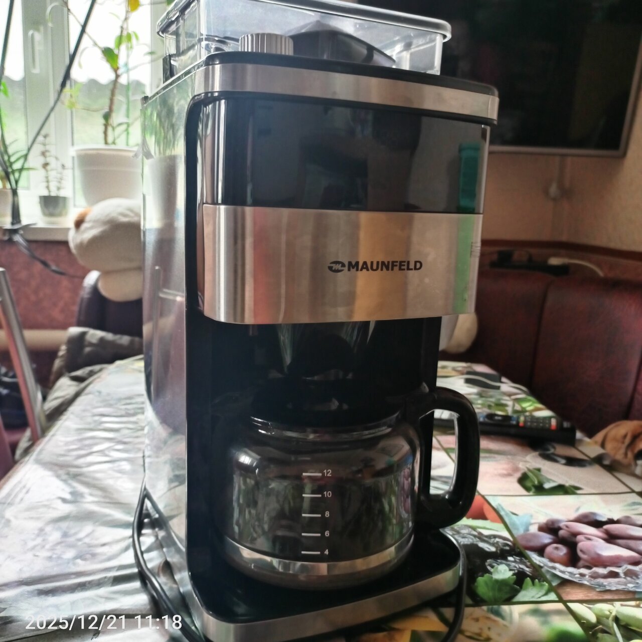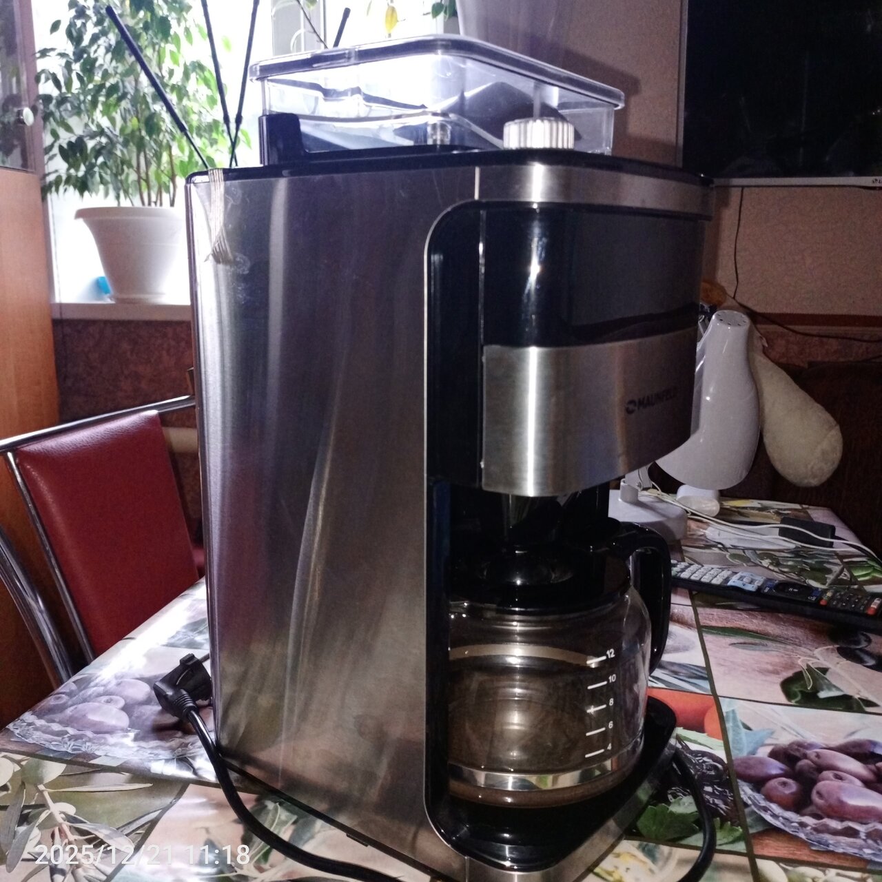 Встроенная кофемолка емкостью 200 грамм. Мощность 1050Вт. Стеклянный кофейник объемом 1.5 литра.