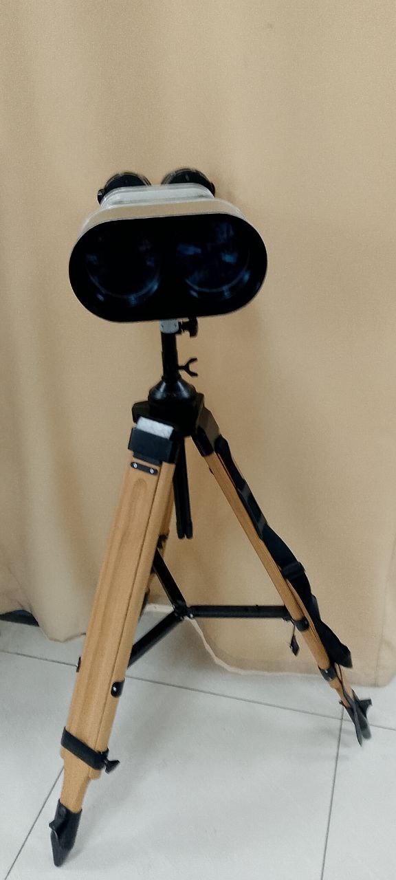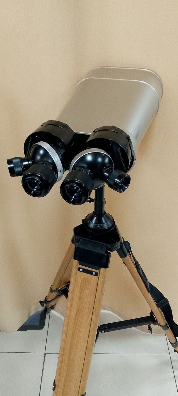 Регулируемый угол наклона бинокля, тренога выдвигается вдвое, верхняя часть съёмная, настольный вариант.