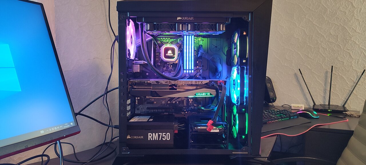 Корпус — Corsair Carbide Series SPEC-OMEGA RGB [CC-9011140-WW] черный, дорогой (цену на него можете глянуть в интернете) качественный корпус, дополнительно было куплено 2 дорогих кулера Corsair LL120 RGB LED [CO-9050071-WW], всего на охлаждение в корпусе установлено 6-120mm кулера с RGB подсветкой (3 спереди, 2 сверху, 1 сзади), боковое закалённое стекло, подсветку можно менять с помощью фирменной программы.
