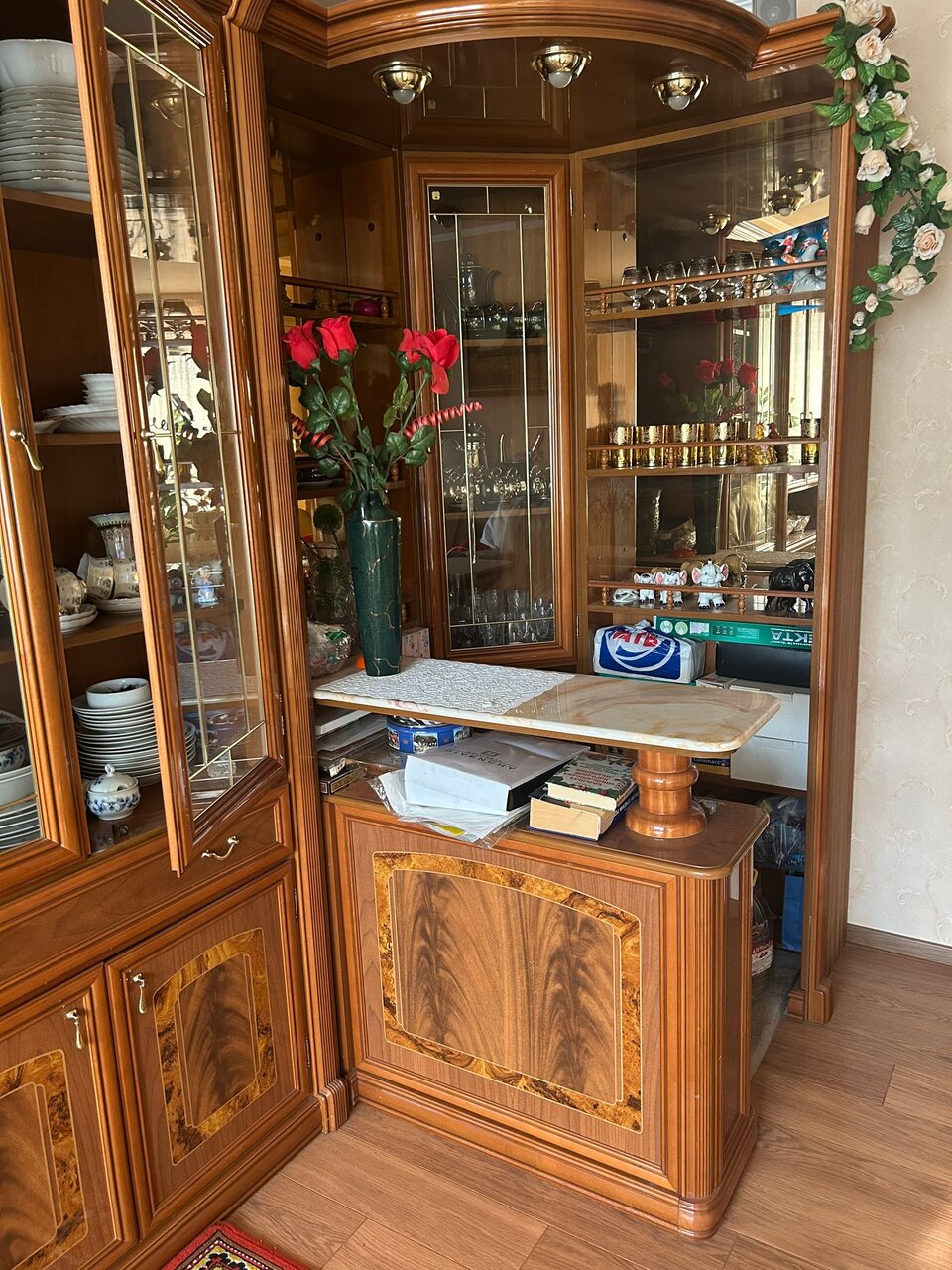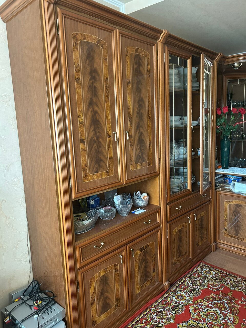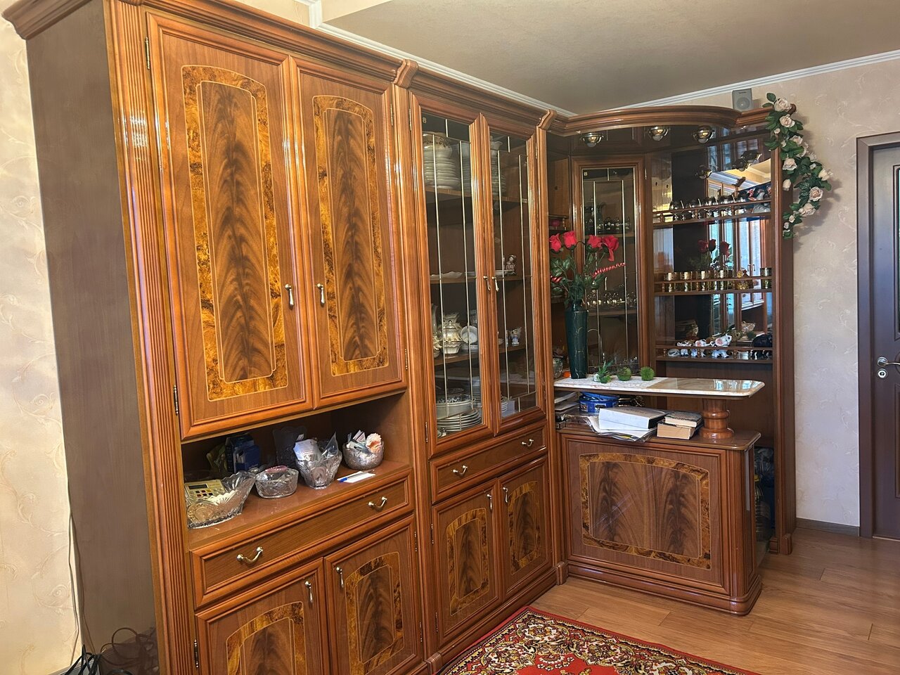 Мебель стенка с баром для зала, кабинета, Италия. Шкафы для посуды, книг, бара, столешница из камня, в баре верхняя подсветка, выделенный пол, стол раздвижной и 4 стула с мягкой обивкой (можно отдельно 80000₽). Цена за комплект 350000₽. Донецк. Галактика. +79493859357 Сергей. В комментариях не нуждаюсь.
