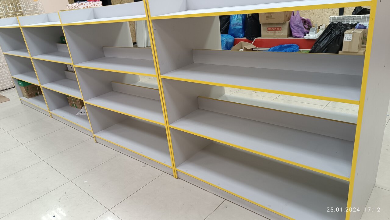 Продам двухсторонний торговый стеллаж в отличном состоянии. Служит для выкладки, хранение и продажи товаров разных категорий в магазине. Стеллаж выполнен из ЛДСП пр-ва Kronoshpan толщиной 16 мм. кромка МДФ.