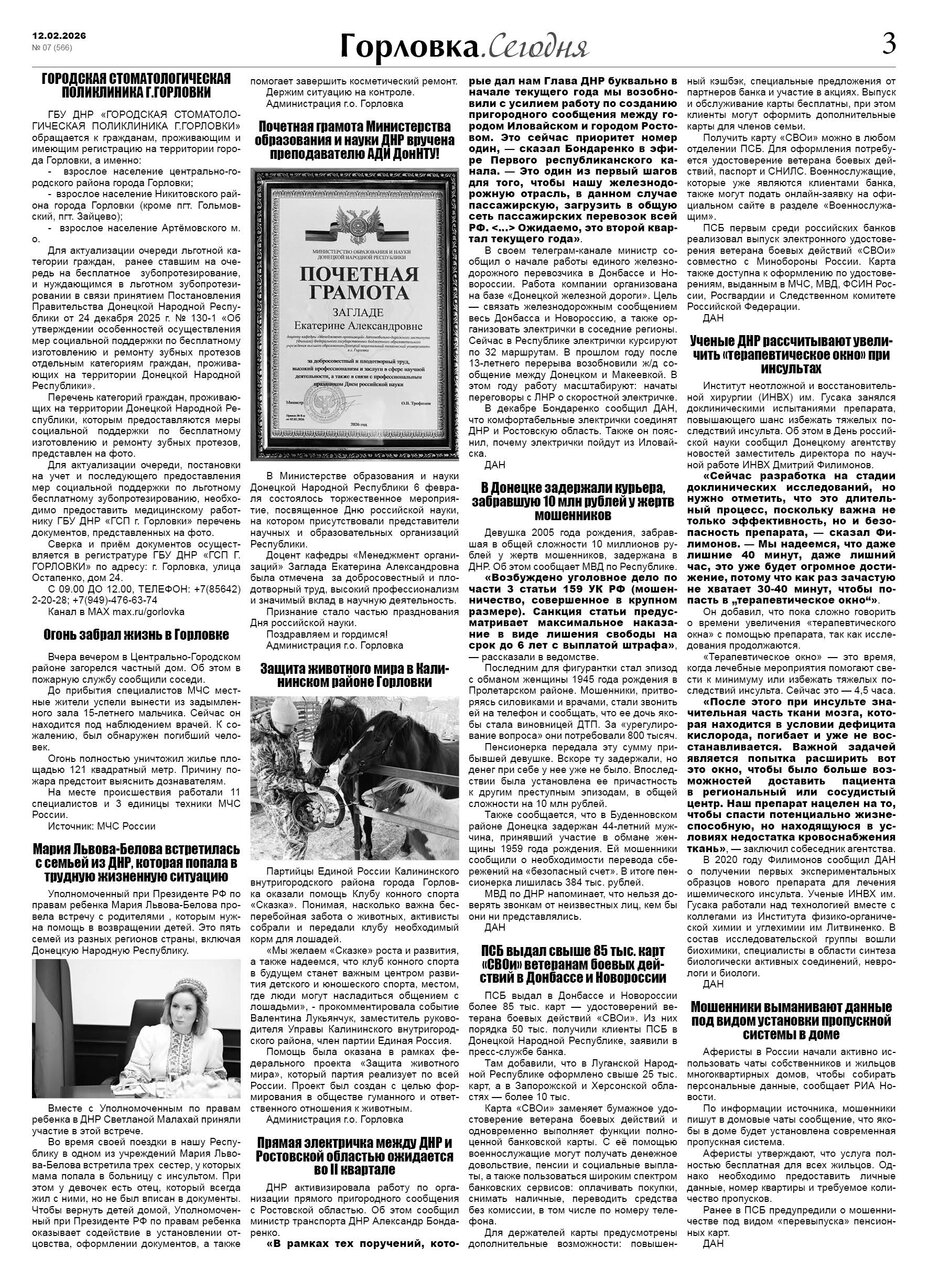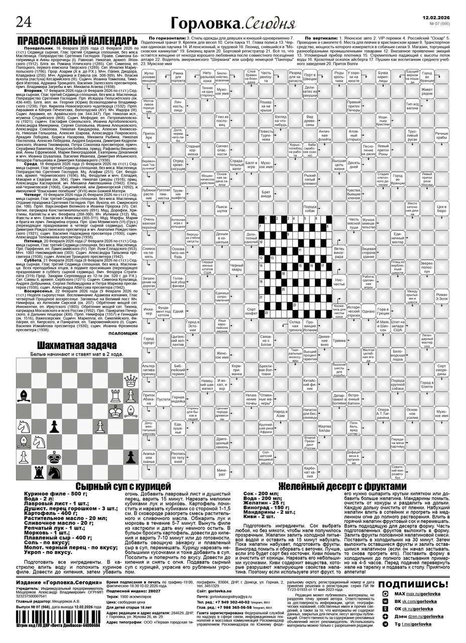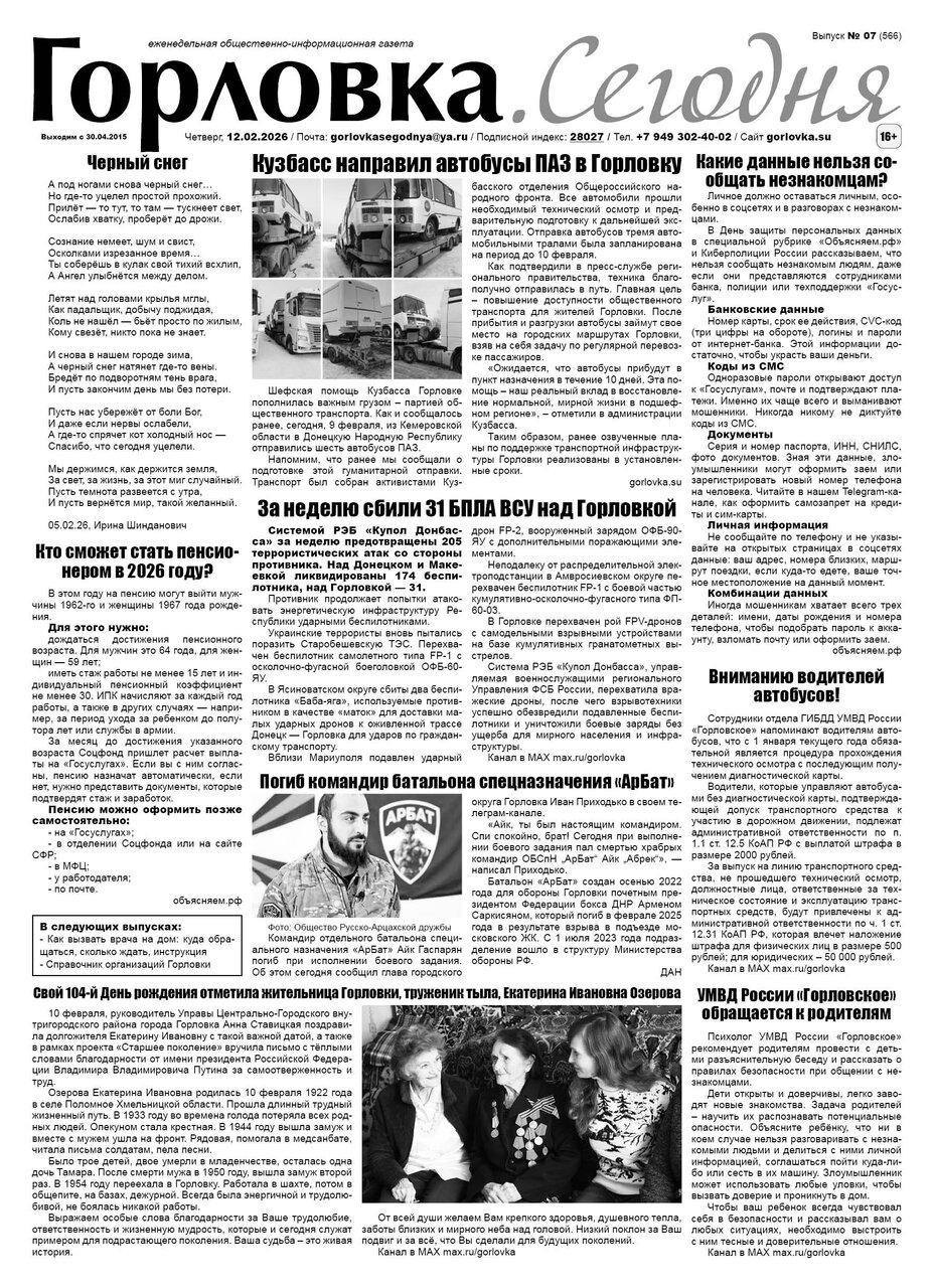 🗞 12 февраля 2026 года, вышел новый выпуск общественно-информационной газеты «Горловка.Сегодня» 🇷🇺 №07 (566). 24 полосы, тираж 1900 экз., газета выходит каждый четверг. 📰 https://t.me/gorlovka