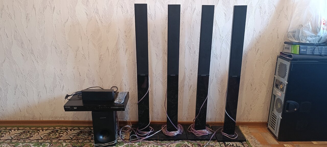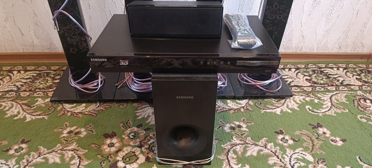Продам домашний кинотеатр 5.1 SAMSUNG HT-H4550R/RU в хорошем состоянии. Все провода на длинных колонках покупались усиленные по 5 метров чтобы можно было раставить по комнате. Всё работает USB, AUX 3.5mm и тд. В комплекте Пульт ДУ, кабель HDMI, кабель AUX 3.5mm.