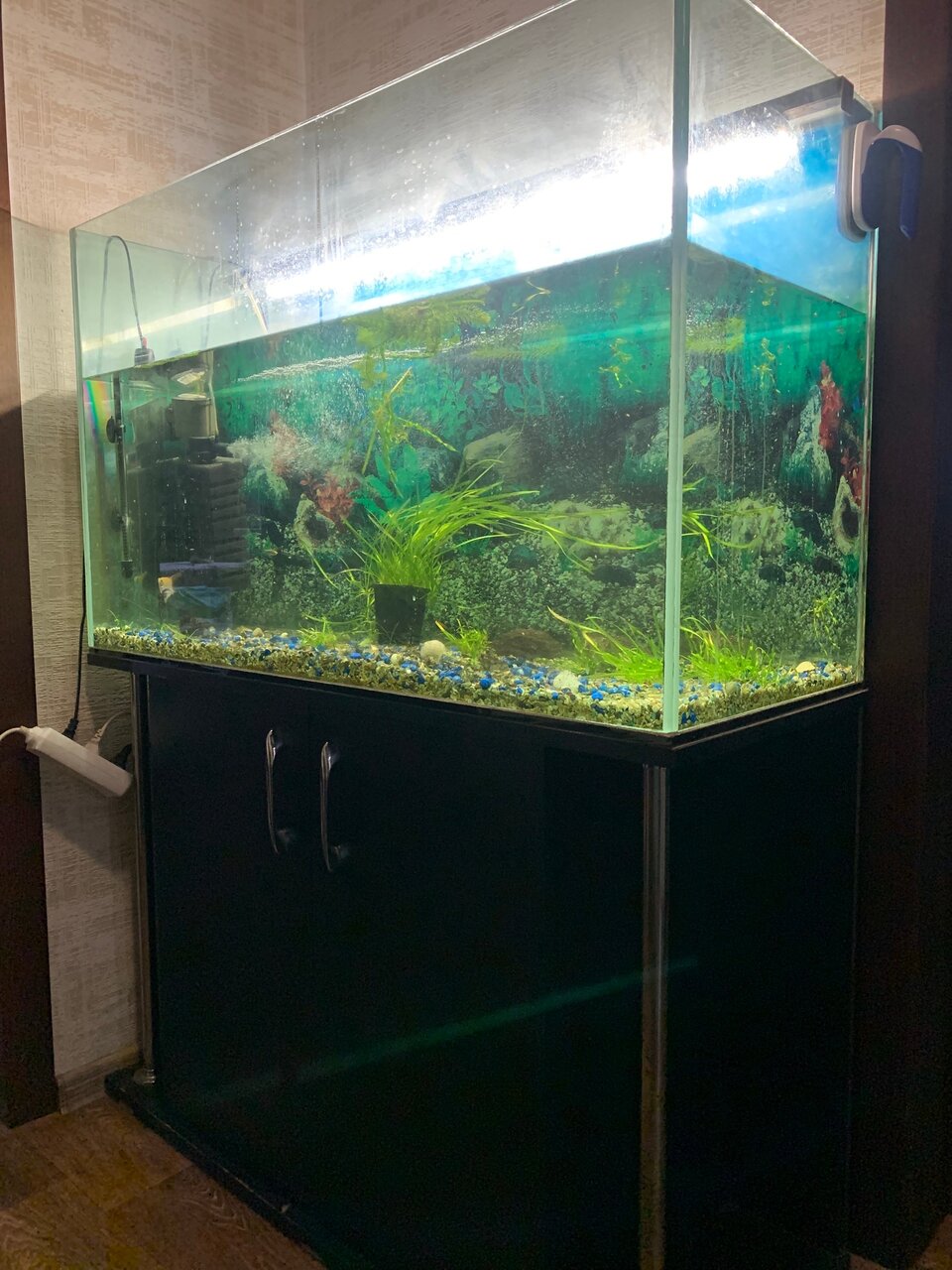 Размер аквариума 100/40/60.Толщина стекла10мл .высота с тумбой 130см обьем 200 литров.Без крышки цена 15000 рублей тел.+79493977617 Гвардейка самовывоз.