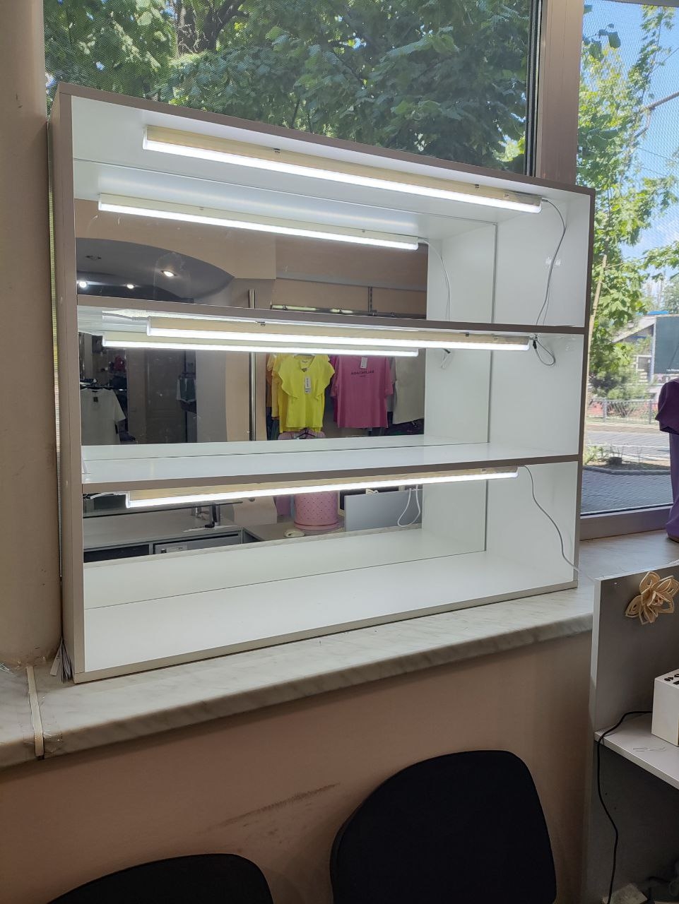 Шкаф с зеркалами и светодиодными лампами на каждой полке.