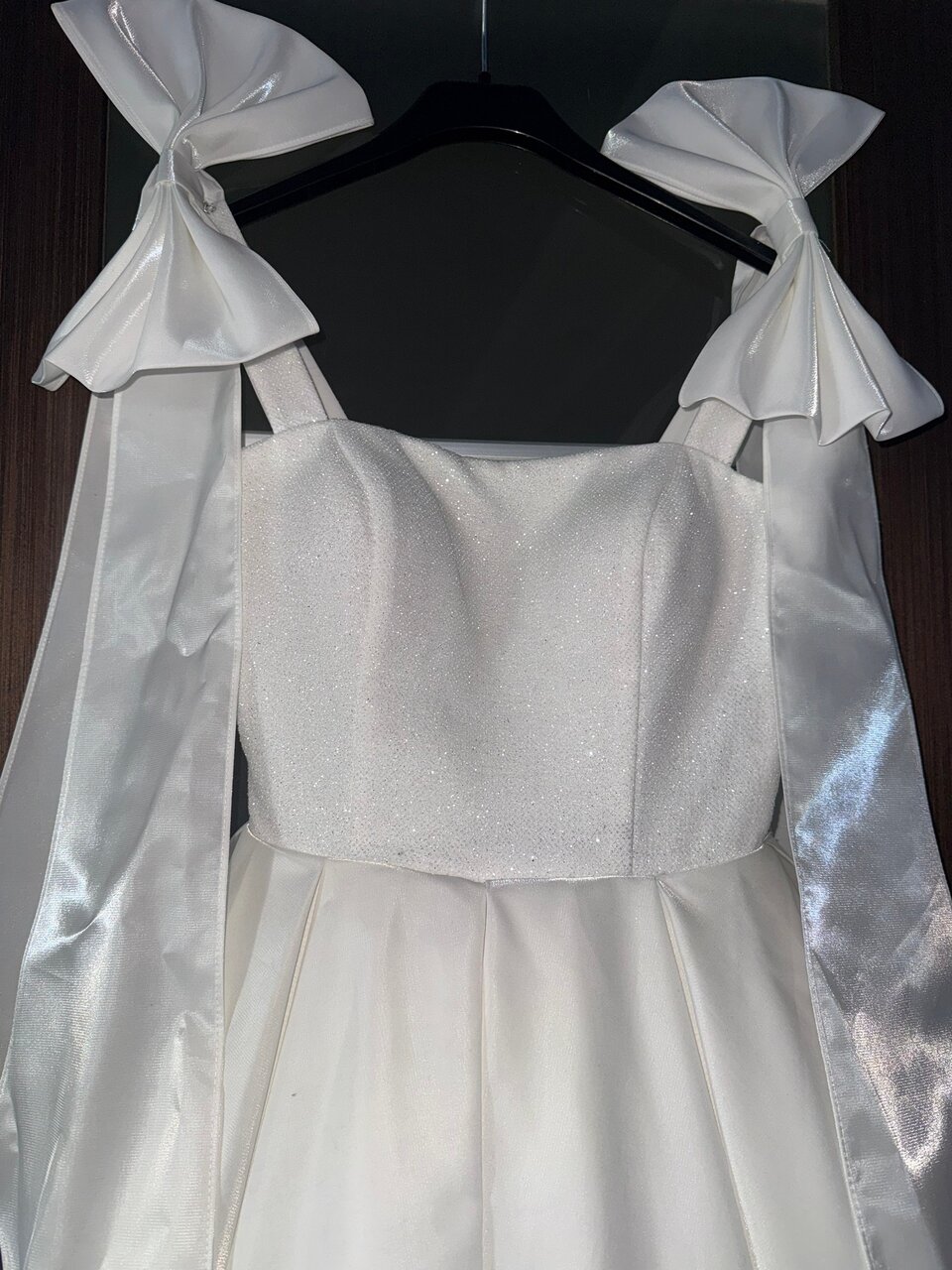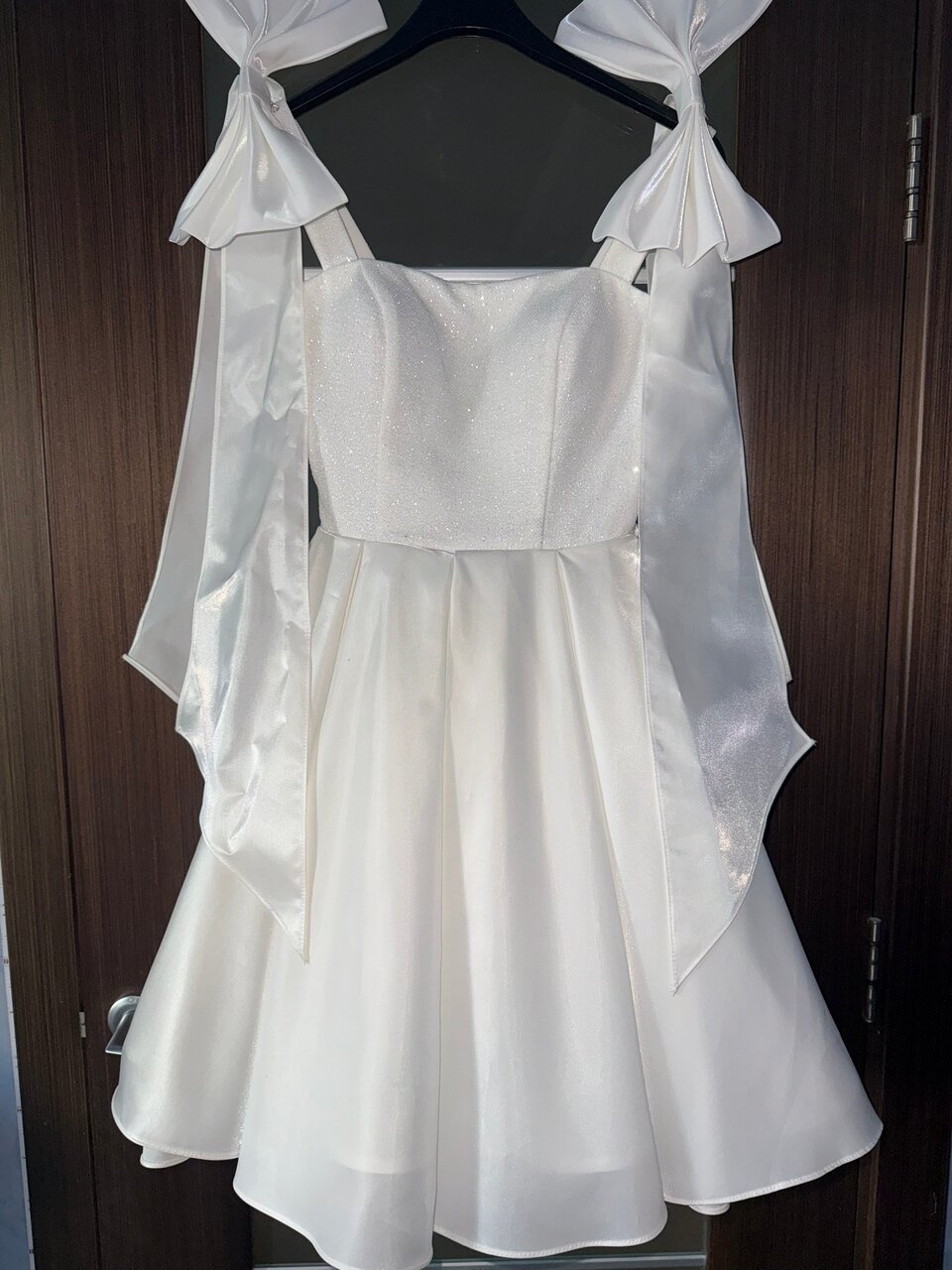 Белое платье с пышным сияющим подъюбником, лиф состоит из блесток и съёмными бантами на плечах. Надевала один раз на выпускной — состояние идеальное.