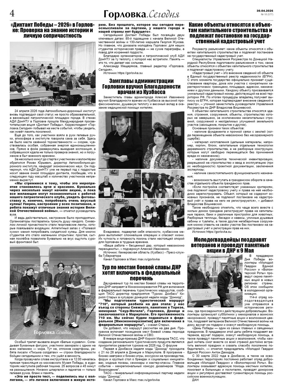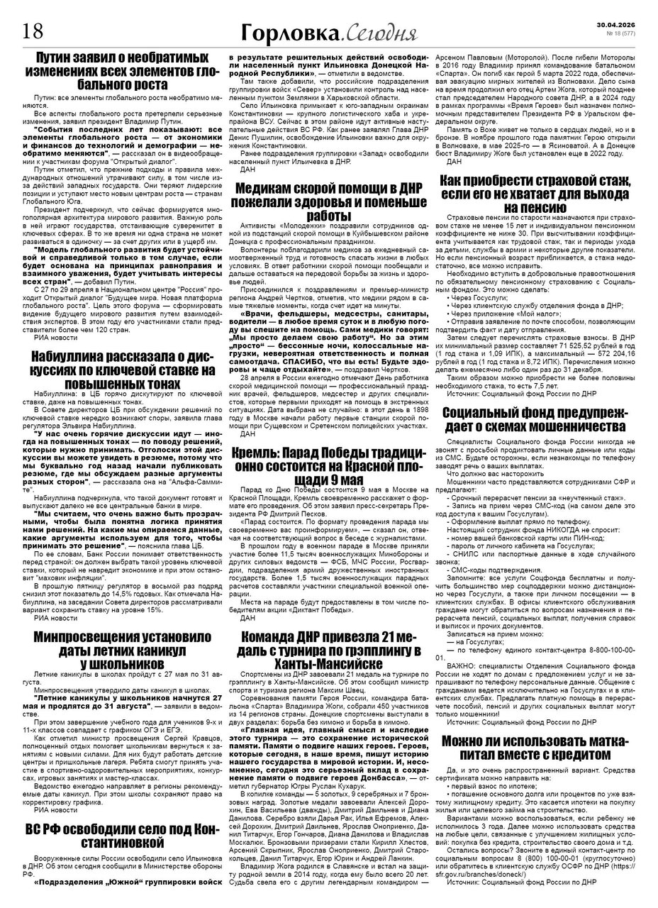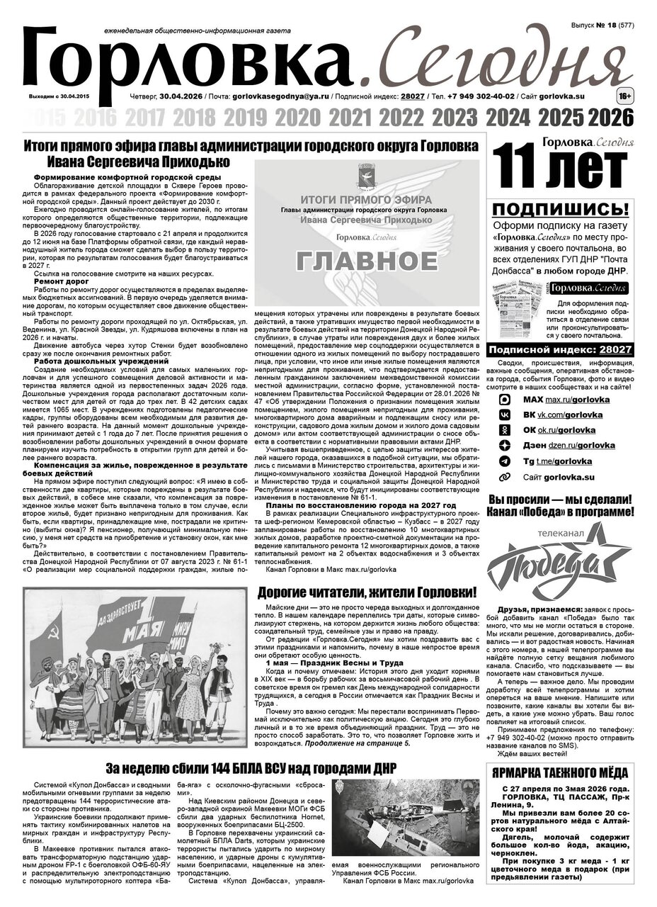 🗞 30 апреля 2026 года, вышел новый выпуск общественно-информационной газеты «Горловка.Сегодня» 🇷🇺 №18 (577). 24 полосы, тираж 1900 экз., газета выходит каждый четверг. 📰 https://max.ru/gorlovka